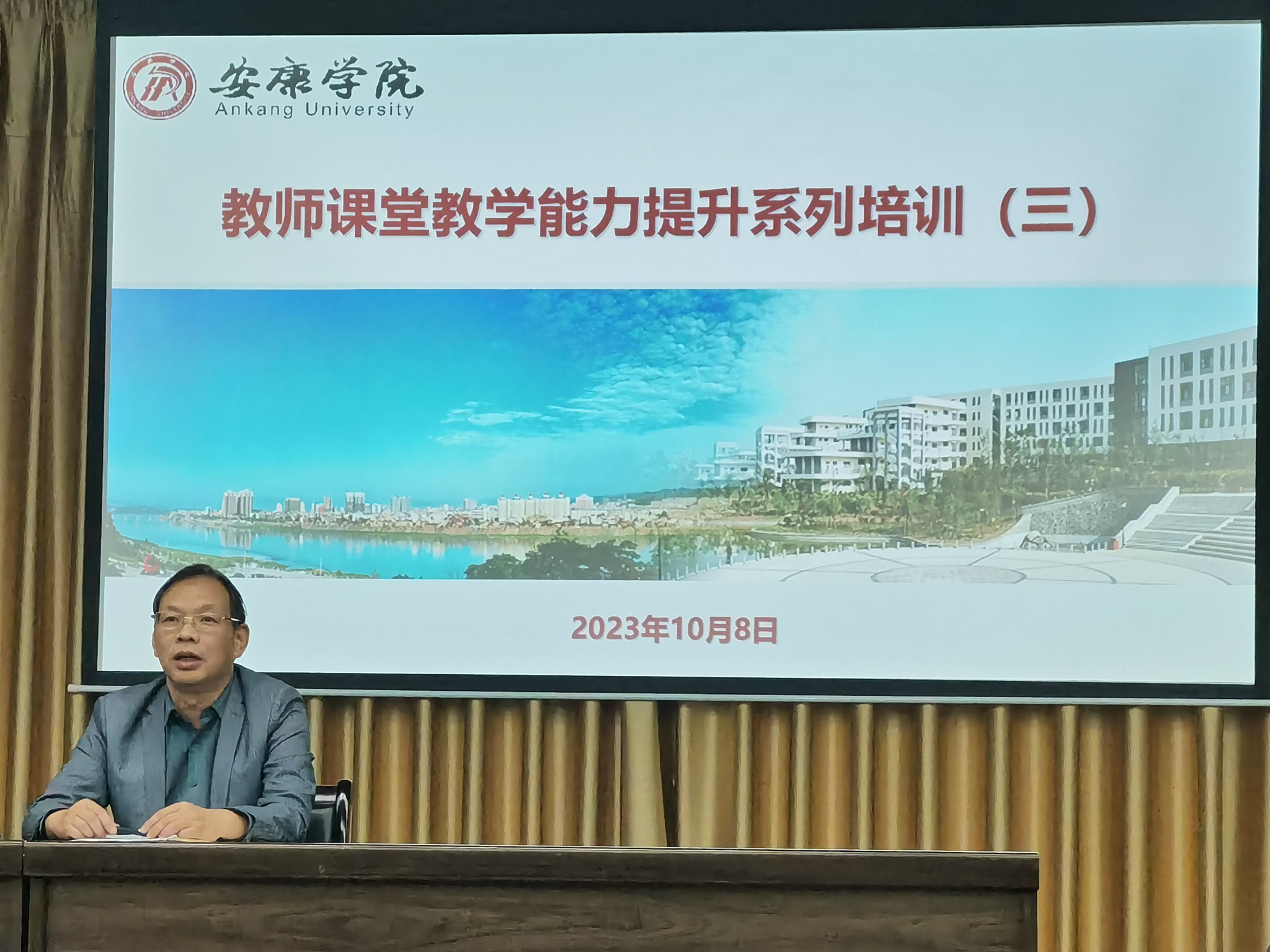 10月8日下午,学校在江南校区图书馆六楼报告厅组织开展了教师课堂教学能力提升第三次培训。本次培训特邀请陕西师范大学现代教学技术教育部重点实验室副主任何聚厚教授作《数字化教学转型背景下智慧教学重构设计与实践》专题报告。各二级学院教学副院长、系(教研室)主任、混合教学改革试点课程负责人及近三年入职专任教师共200余人参加了培训。培训由教务处处长汪义瑞主持。