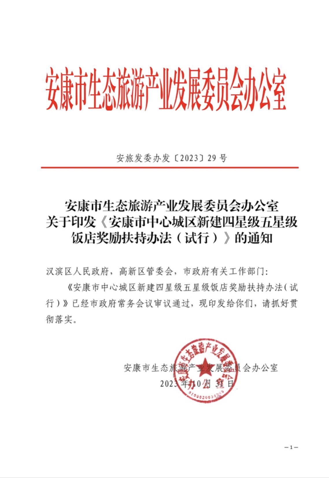 近日,由best365官网负责起草的《安康市中心城区新建四星级五星级饭店奖励扶持办法(试行)》(安旅发委办发〔2023〕29 号),经安康市人民政府2023年第14次常务会议审议通过,2023年10月31日正式印发并实施。