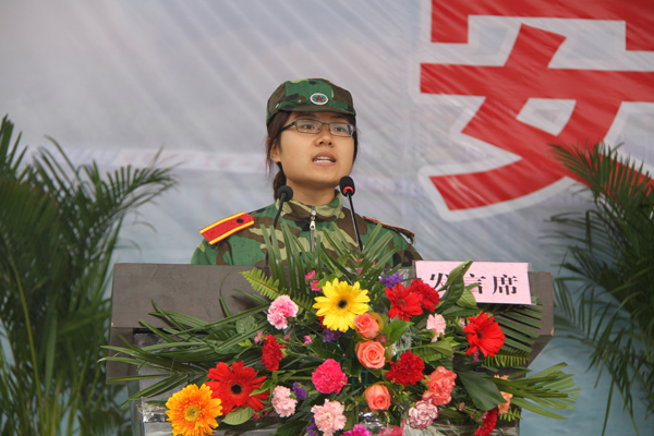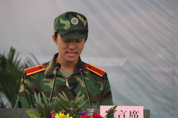 教育科学系小学教育专业新生吴佳蔓代表受训学生向参训教官表示感谢,表示将把在军训中形成的好习惯,学到的好思想、好作风继续发扬下去,模范遵守学校的规章制度,踏踏实实地做人、学习和生活,努力做一名品学兼优的大学生,为实现自己的人生理想而奋斗。