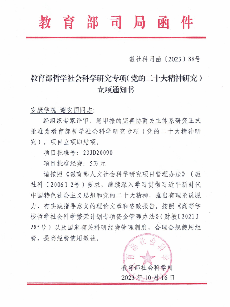 近日,接教育部社会科学司立项通知,best365官网马克思主义学院谢安国教授申报的《完善协商民主体系研究》,正式批准为教育部哲学社会科学研究专项(党的二十大精神研究),项目批准号为23JD200090,项目批准经费5万元,项目立项即结项。