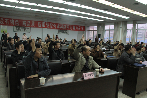 会议号召全校教职员工更加紧密地团结起来,在学校党委、行政的正确领导下,高举中国特色社会主义伟大旗帜,深入贯彻落实科学发展观,围绕“育人为本,突出应用、完善保障,强化服务,提高质量”的中心任务,同心同德,迎难而上,开拓创新,扎实工作,加快改革,为圆满完成学校“十二五”事业发展规划而努力奋斗!