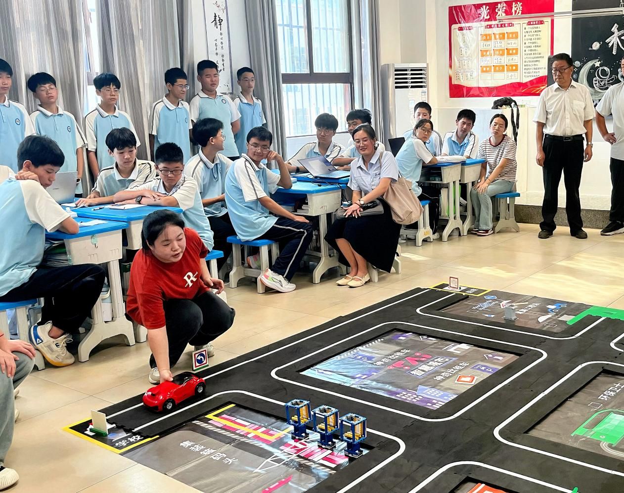活动中,团队指导教师姚娜和学生成员展示了无人驾驶智能车在“外卖骑手”及“急救先锋”板块的具体操作。通过摄像头以及mixly程序设计,无人驾驶智能车从起点出发,进行道路直行、标志识别、转弯掉头等动作,顺利完成指定任务。