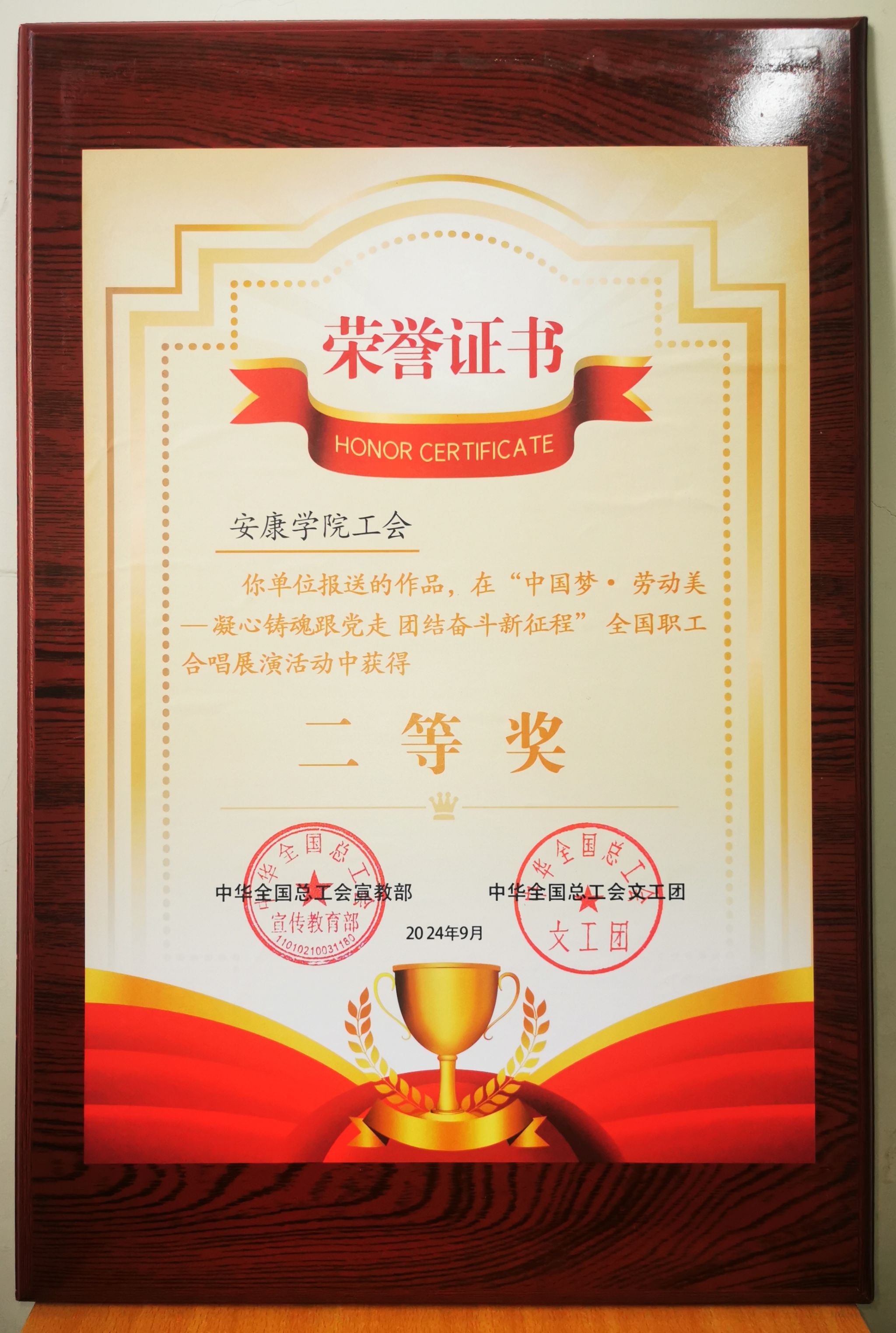 在新中国成立75周年前夕,由全国总工会宣传教育部、浙江省总工会、全总文工团联合主办,浙江省湖州市总工会承办的“中国梦·劳动美——凝心铸魂跟党走 团结奋斗新征程”全国职工合唱展演活动在浙江湖州举行。best365英国体育在线合唱团参加现场展演并荣获二等奖。