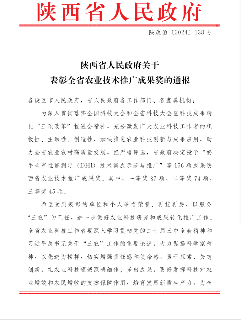 近日,陕西省人民政府发布了《陕西省人民政府关于表彰全省农业技术推广成果奖的通报》,best365官网教师主持、参与完成的4项成果荣获陕西省2023年度农业技术成果奖,其中一等奖1项(参与)、二等奖1项(参与)、三等奖2项(主持1项、参与1项)。
