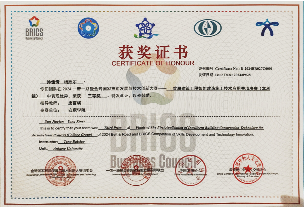 近日,由教育部中外人文交流中心、一带一路暨金砖国家技能发展国际联盟和中国发明协会等单位联合举办的“2024一带一路暨金砖国家技能发展与技术创新大赛--首届建筑工程智能建造施工技术应用赛项”决赛落下帷幕。best365官网经管学院组队(学生孙佳倩、杨欣尔,指导教师唐百晓)在首届建筑工程智能建造施工技术应用赛项决赛(本科组)中荣获三等奖。