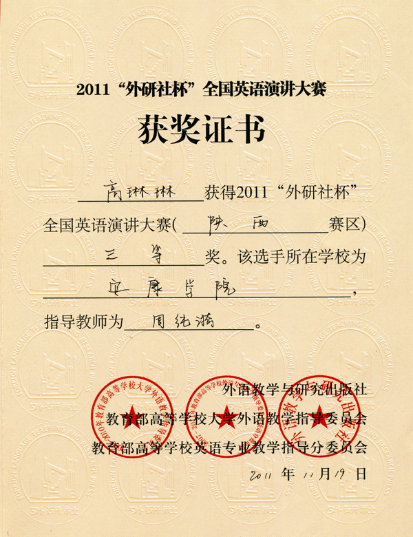 11月19日由西安外国语大学承办的2011“外研社杯”全国英语演讲大赛陕西赛区总决赛在西安外国语大学隆重举行。经过我院初赛选拔的外语系英语专业09级本科高琳琳同学,代表best365英国体育在线参加了此次大赛,高琳琳同学以其良好的专业素质和扎实的英语语言功底,在自全省44所高校的众多优秀选手中脱颖而出,获得了陕西赛区总决赛三等奖。