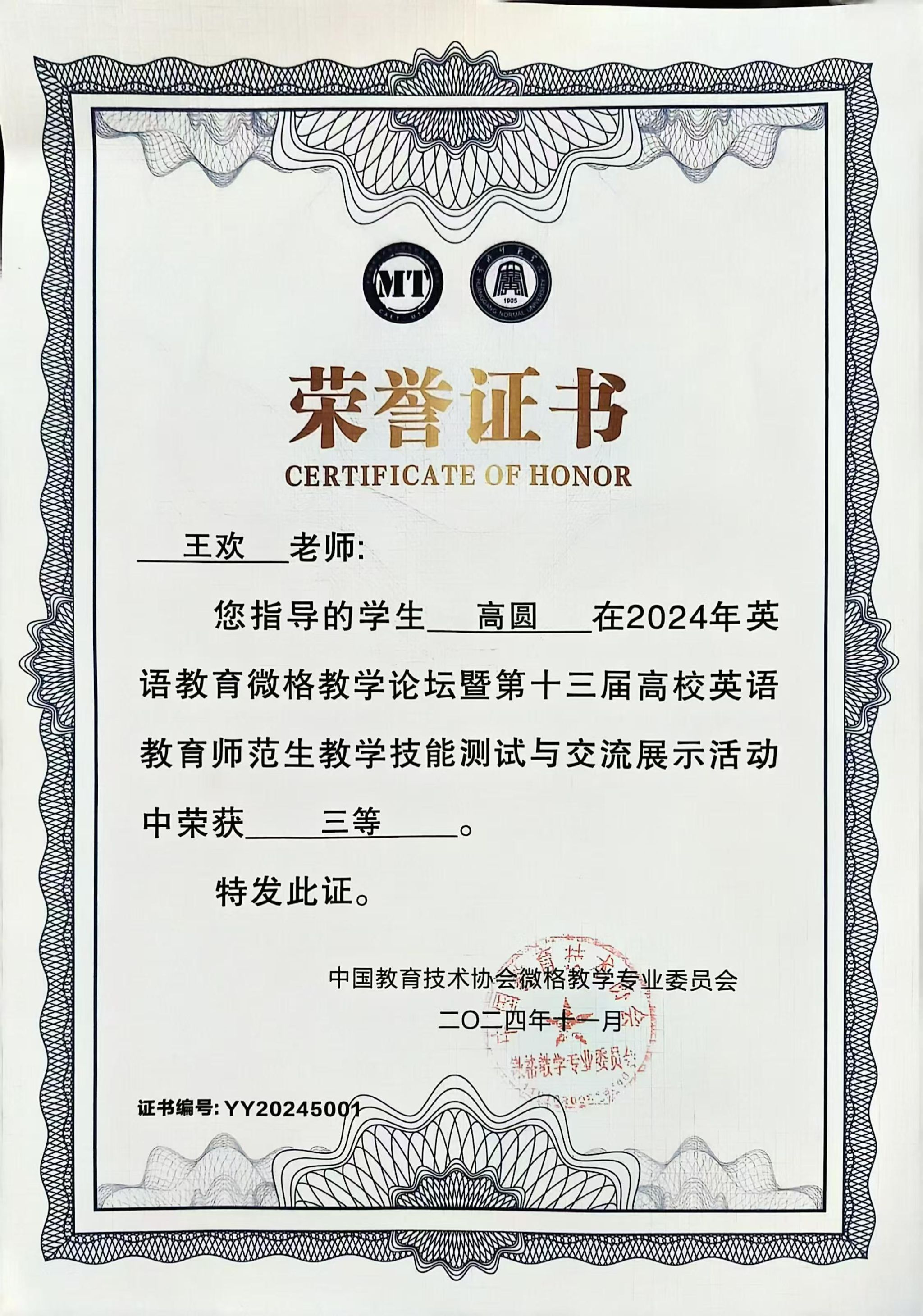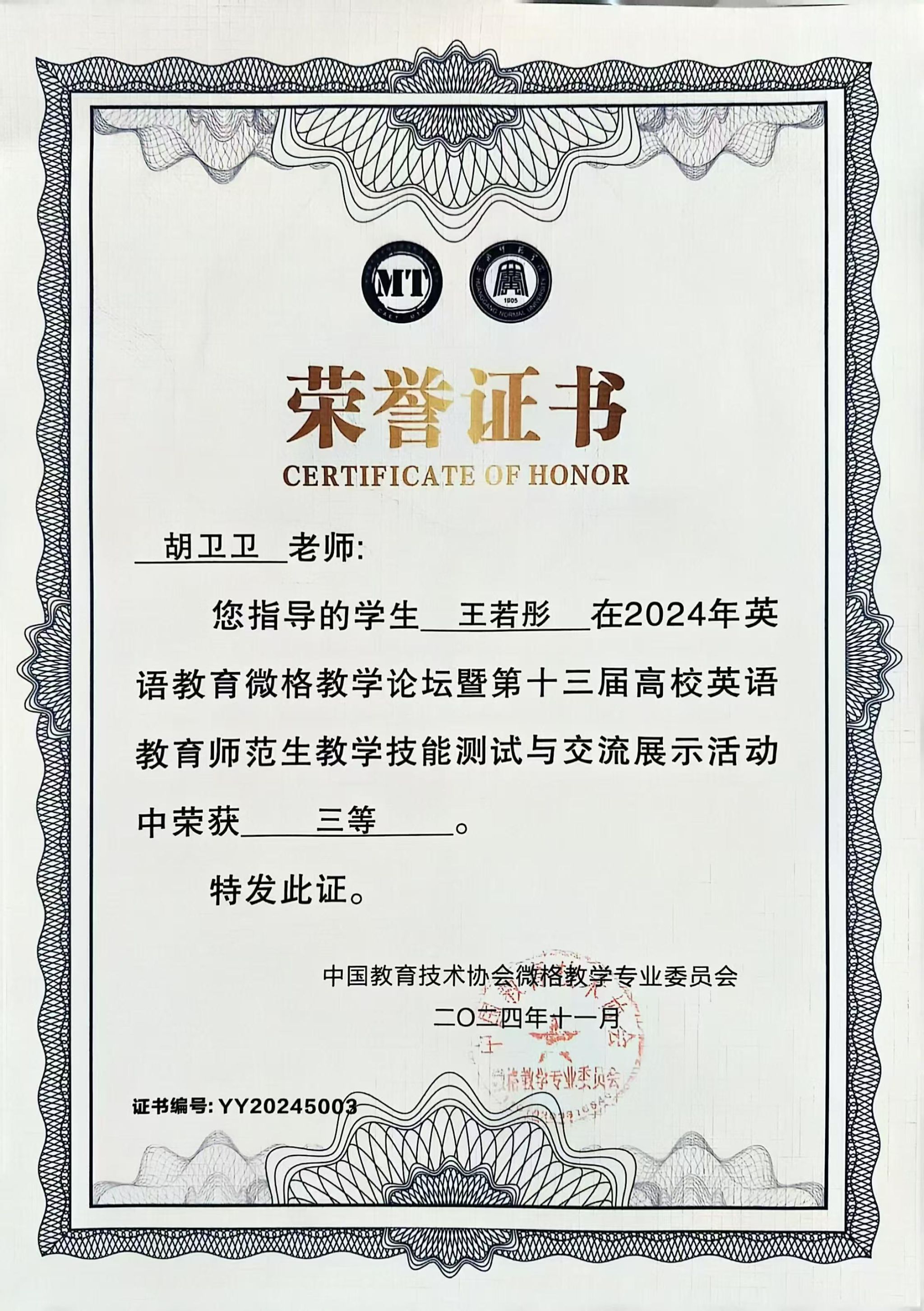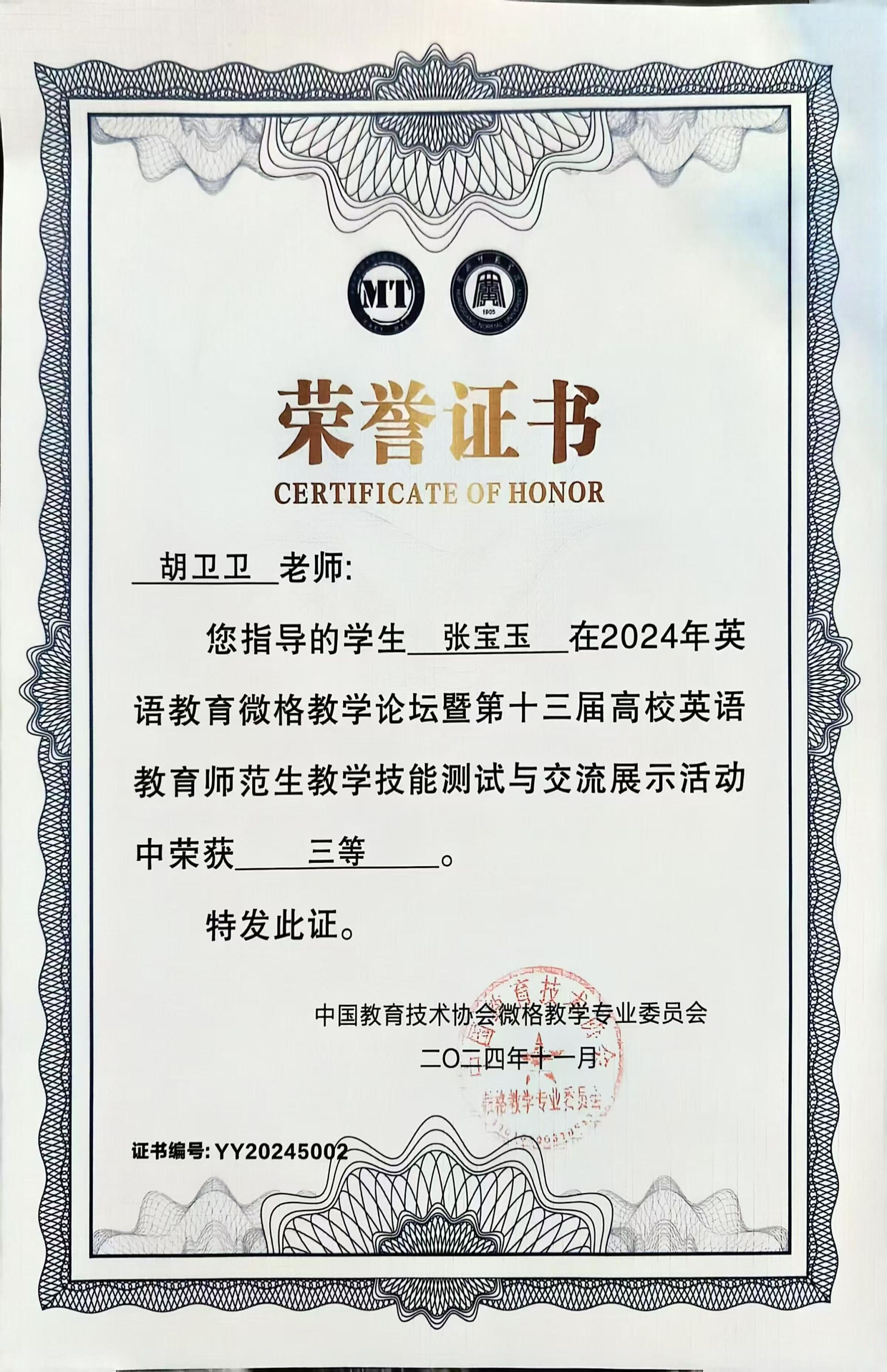 近日,2024年英语教育微格教学论坛暨第十三届高校英语教育师范生教学技能测试与交流展示活动在黄冈师范学院成功举行。best365官网外语学院英语专业学生王若彤、张宝玉和高圆经过教学设计评比、现场说课、模拟授课、现场答辩等环节的激烈比拼,获得本科组三等奖。