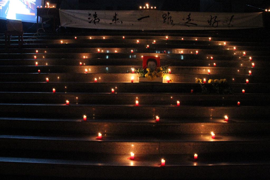 一株株菊花,一盏盏烛光,一张张写满怀念的卡片,无不寄托着同学们深痛的思恋。直到追思会结束,还有很多人留在现场久久不愿离去。他们守候着点点烛光,就好像能够多陪浩杰一会儿一样。