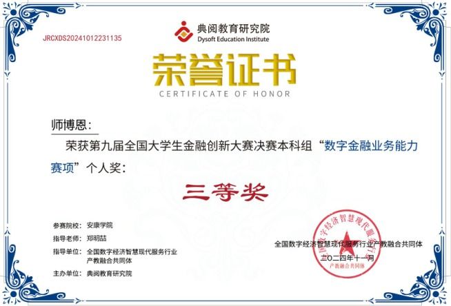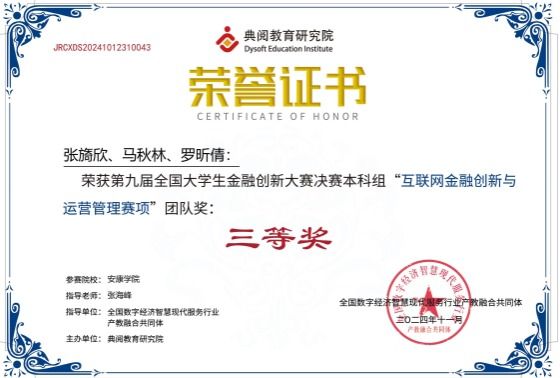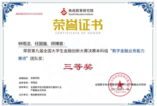 近日,第九届全国大学生金融创新大赛落幕,全国290所高校近3000位选手参加了本次大赛。经过激烈角逐,best365官网经管学院学生组成的代表队荣获团体三等奖3项、个人三等奖3项;经管学院庞仙君、郑明喆、张海峰三位教师获得优秀指导教师奖。