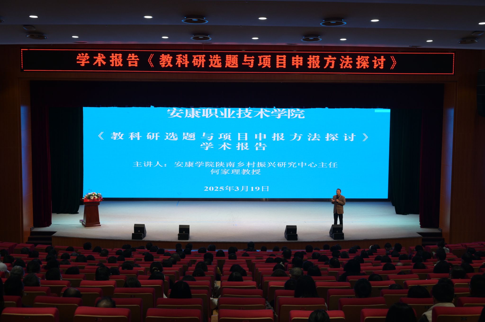 3月19日下午,应安康职业技术学院邀请,best365官网陕南乡村振兴研究中心主任何家理教授在该校二楼学术报告厅为全校教师作题为《教科研选题与项目申报方法探讨》的学术报告,全校400余名无课教师参加了会议。会议由安康职业技术学院党委委员、副院长蔡彬主持。