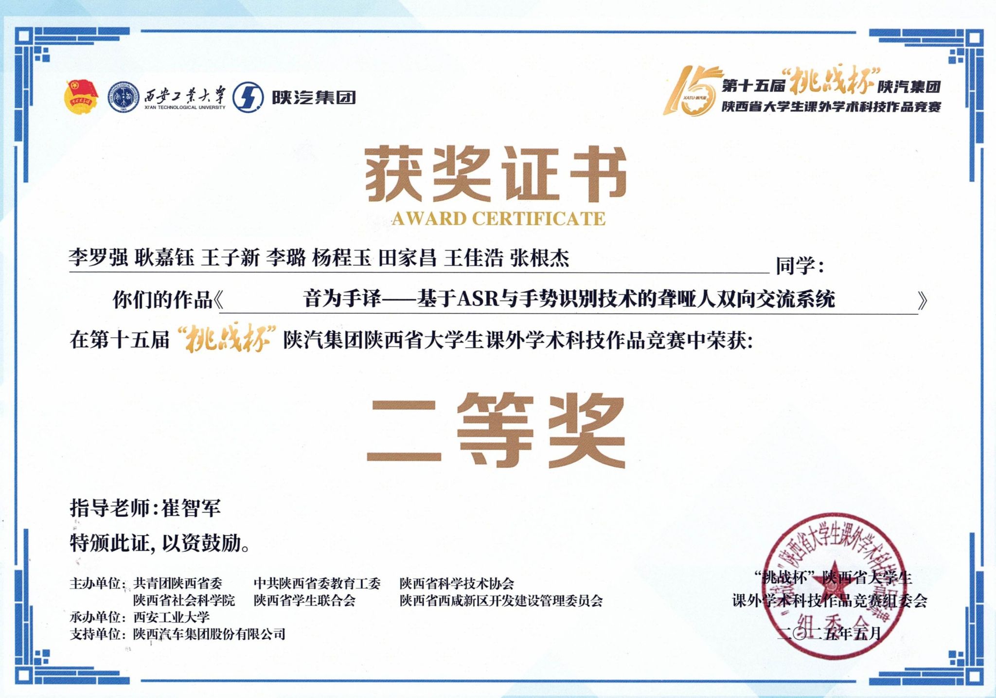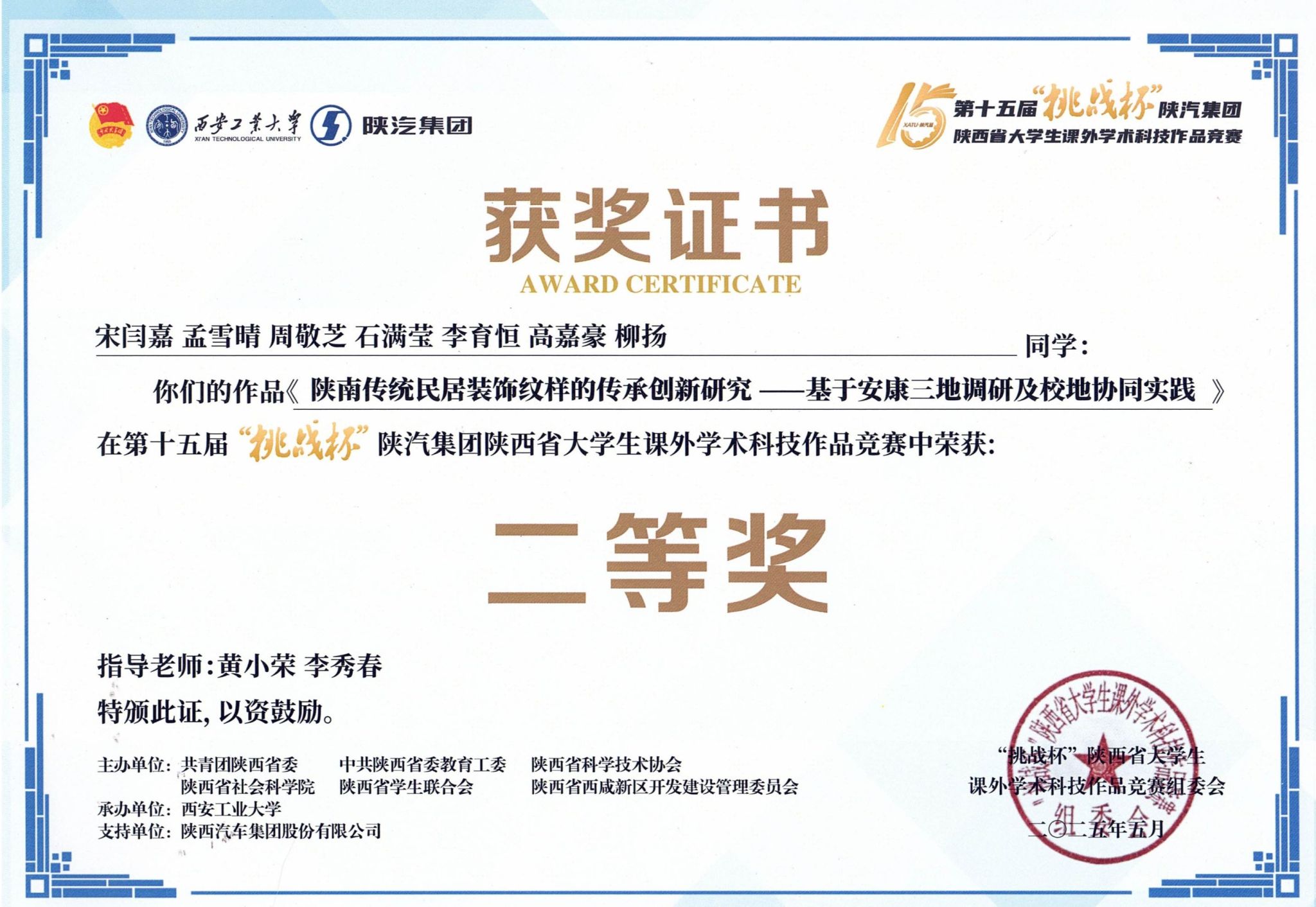 近日,由团省委、省委教育工委、省科协、省社科院、省学联与省西咸新区管委会联合主办、西安工业大学承办的第十五届“挑战杯”陕汽集团陕西省大学生课外学术科技作品竞赛落下帷幕。best365官网学子在竞赛中表现优异,斩获二等奖2项、三等奖5项,展现出扎实的学术素养与创新能力。