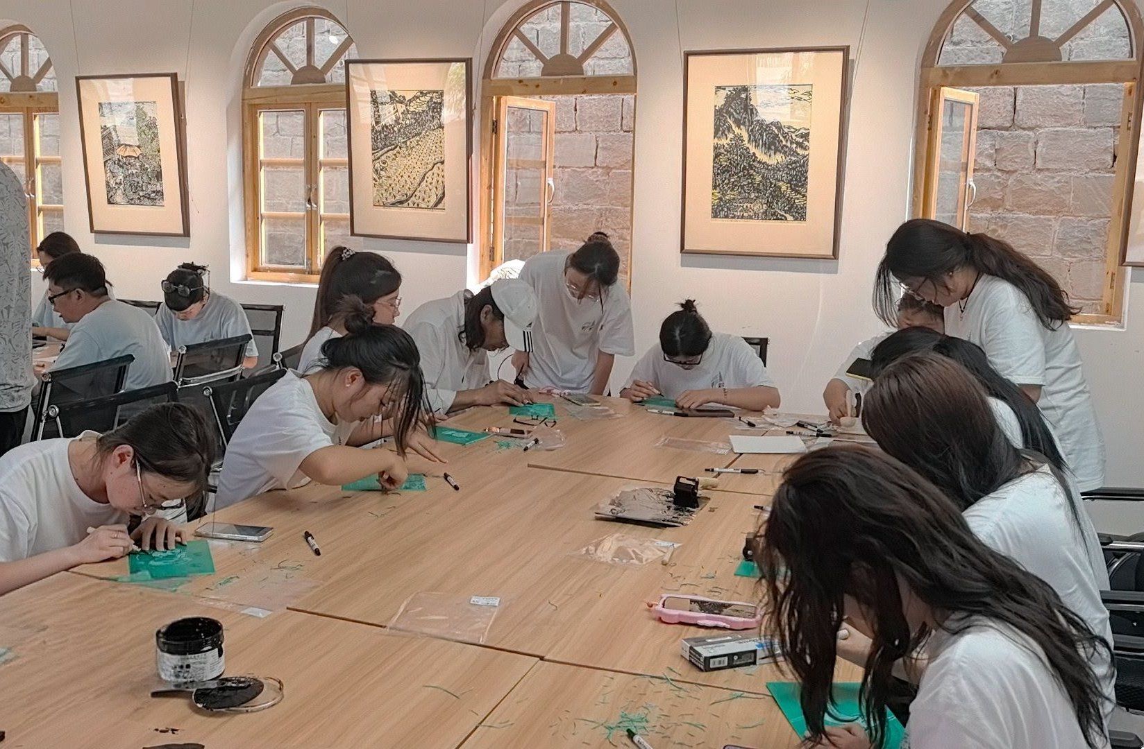 团队采用艺术化表达激活革命文物的时代生命力。在桥儿沟革命旧址参与《一笔一刻》版画制作时,将延安精神元素与秦巴民俗符号相融合,以鲁迅艺术文学院“红色艺术传统”为内核,用刻刀与颜料再现延安时期文艺工作者“为革命服务”的创作初心,赋予革命历史新的视觉表达。