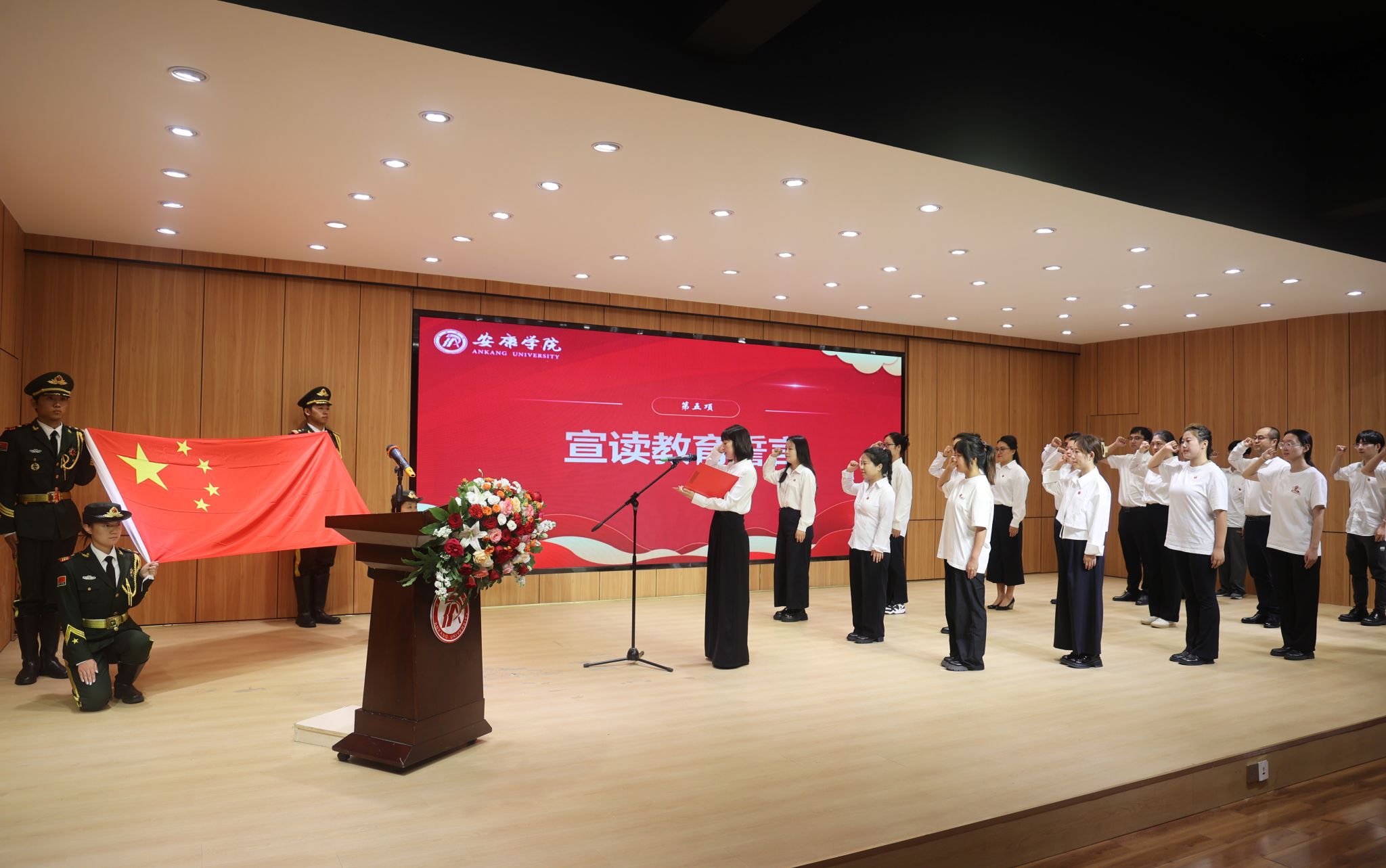 随后,公费师范生代表和2025年新入职教师在领誓人李朴的带领下,面向国旗庄严宣读教育誓言。“忠诚党的教育事业,落实立德树人根本任务……”铿锵有力的誓言回荡在会场,不仅展现了新入职教师与师范生投身教育事业的坚定决心,更彰显了学校教育事业薪火相传、蓬勃发展的生机与活力。