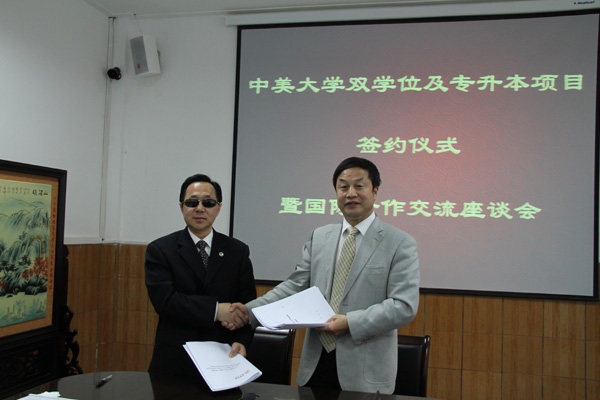 校长王兴林(右)与美国经济文化交流协会国际部主任武康签署合作协议