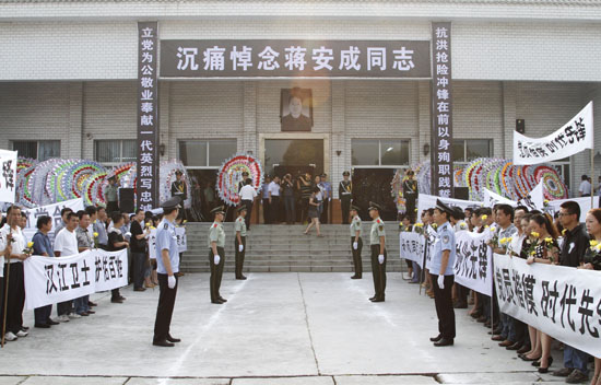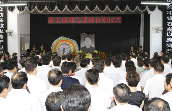7月6日上午8时30分,牺牲在防汛第一线的蒋安成同志遗体告别仪式在南郑县殡仪馆隆重举行,省市领导及近千名各界人士怀着无比沉痛的心情,为这位党的好儿女,人民的好公仆送行。
