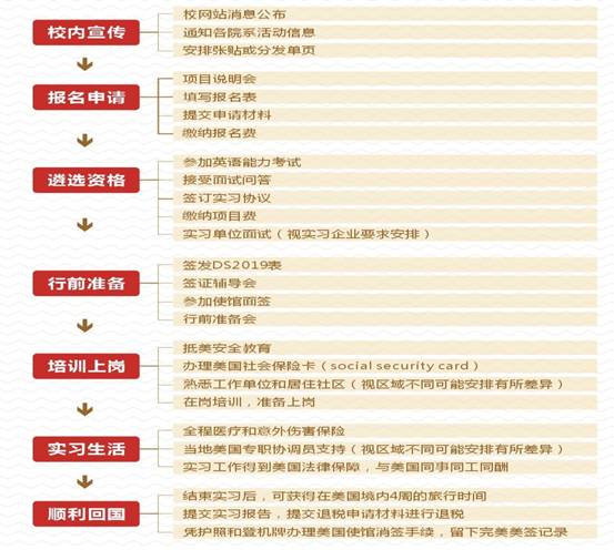 费用包含:申请综合评估、签证预约、签证辅导、美国实习名额、DS-2019表、行前辅导、培训、实习手册、全程美国医疗保险和意外伤害保险、美国当地紧急支援服务等。