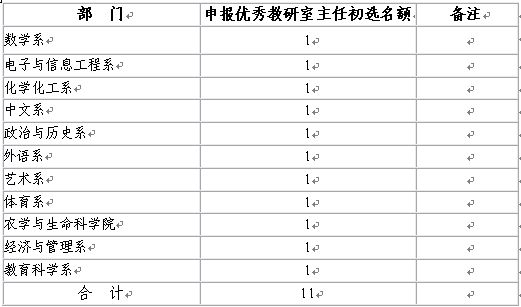 四、评选要求 1.各院系和教研室要高度重视,认真组织评选。要以评优工作为契机,建立健全教研室规章制度,规范教研室的管理,促进教研室的建设,从而推动学校教学工作的全面开展。 2.要坚持公开、公正、客观、合理的原则。本次评选要重点突出教学及教学管理工作,所评选出来的优秀教研室主任要能真正起模范带头作用,要进行公示,力求做到公开、公正、客观、合理。 3.要按照学校文件要求组织初评,及时向教务处申报,报送材料要真实、完备,不能弄虚作假。