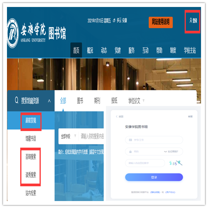 使用方式(2):图书馆网站首页点击“登录”按钮,输入学习通的账号密码,登录成功后,利用“超星发现”“百链搜索”“读秀搜索”使用。