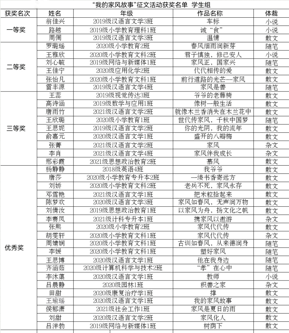 2021年6月—9月,best365官网举办了“我的家风故事”征文活动。本次征文活动由纪委综合室和文学与传媒学院主办,文传学院文学创作社、国学读书社承办。活动共征集222篇稿件,经专业老师评审,评出学生组获奖作品38篇,教师组获奖作品8篇。现将征文评选结果予以公示(获奖名单见附件),公示时间从10月14日至16日。公示期间,如对获奖名单有异议,请向纪委综合室反映,联系电话:3261865。